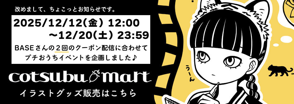 続きを読むこんばんは、ミカヅキです。 お知らせが遅くなってしまいましたが、今週末からオンラインショップcotsubumartにて「プチおうちイベント」を開催します。BASEさんの2回のクーポン配信のタイミングに …
